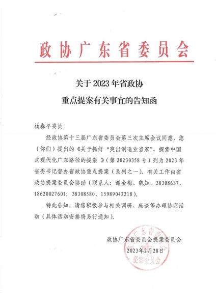 此次提案,杨森平教授分别从经济发展和文化传承的角度,站在人民的立场,热心参政,严格秉持党的二十大报告提出的“坚持把发展经济的着力点放在实体经济上,推进新型工业化,加快建设制造强国”“支持专精特新企业发展,推动制造业高端化、智能化、绿色化发展”等重要论述,切实维护宝贵的历史文化遗产,为中共广东省委部署的重点工作建言献策。