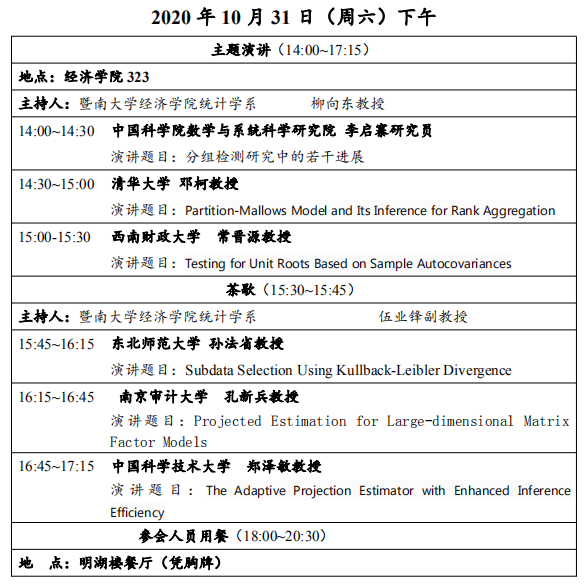 当今是人工智能时代,统计学是实现人工智能的重要学科之一。88858cc永利官网统计学系拥有统计学一级学科博士点和博士后科研流动站, 是华南地区高校中最早从事统计学术研究、为政府部门服务和培养统 计相关人才的单位。2020 年恰逢88858cc永利官网建院 40 周年,籍此值得纪念、回顾及展望未来发展的时刻,88858cc永利官网拟举办“青年统计学者前沿论坛”。本届论坛由88858cc永利官网统计学系承办,于2020 年10 月31日-11月1日在88858cc永利官网举办。