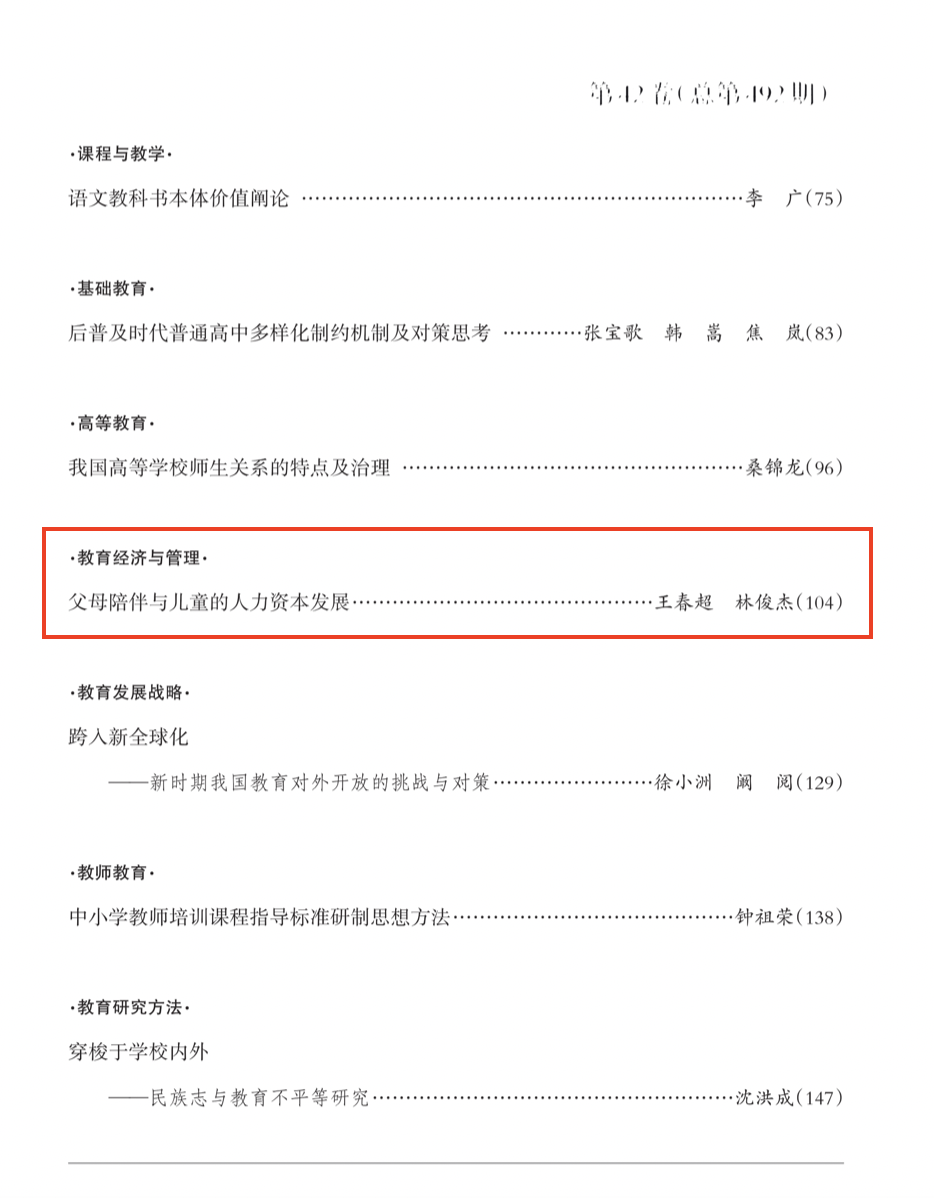 近日,88858cc永利官网经济学系王春超老师与其指导的硕士生林俊杰完成的关于教育经济学的文章《父母陪伴与儿童的人力资本发展》在权威期刊《教育研究》2021年第1期发表。期刊《教育研究》为教育部主管、中国教育科学研究院主办的全国性、综合性教育理论学术刊物,是教育理论界首选的权威刊物,同时也是我校A1类刊物。